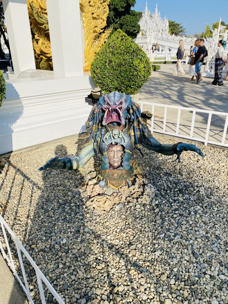 ワット・ロンクンに近づくと、寺院の白さと大きさ、そして美しさに驚きますが、入場ゲートに近づくと以下のような怖いオブジェがあって驚きました。